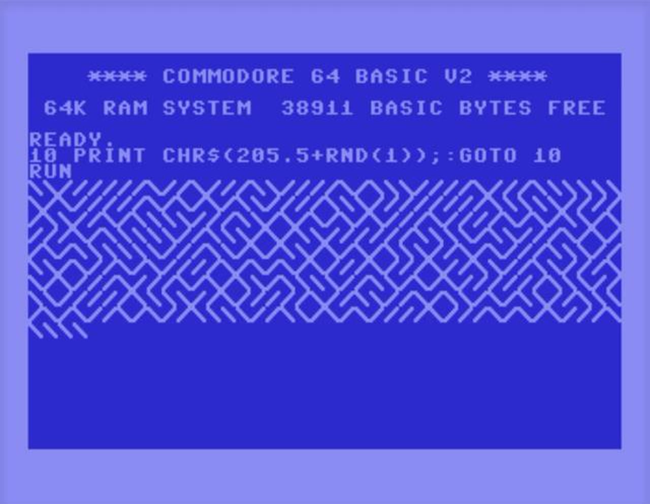 10 PRINT CHR$(205.5+RND(1)); : GOTO 10