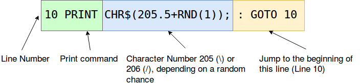 10 PRINT CHR$(205.5+RND(1)); : GOTO 10